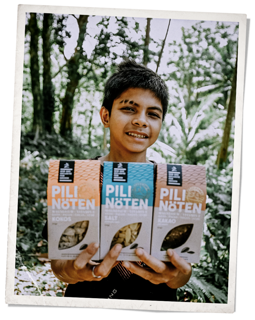 Sedan första dagen har vi arbetat hårt för att skapa otroligt starka och etiska relationer med lokalbefolkningen genom att erbjuda stabila, rättvisa jobb som stöder både den filippinska gemenskapen och deras naturliga ekosystem. Pilinöten är vildvuxen och växer i rika vulkaniska jordar i Filippinerna utan förstörelse av den naturliga miljön eller dess vattenförsörjning. Dom vilda piliträden som vi skördar från är fria från bekämpningsmedel, kemiska gödningsmedel och genetiska modifieringar. Växer i takt med att dom får väldigt mycket naturligt solljus. Pilinötterna ändras årligen av Filippinernas regnskogs ständigt föränderliga rytmer.